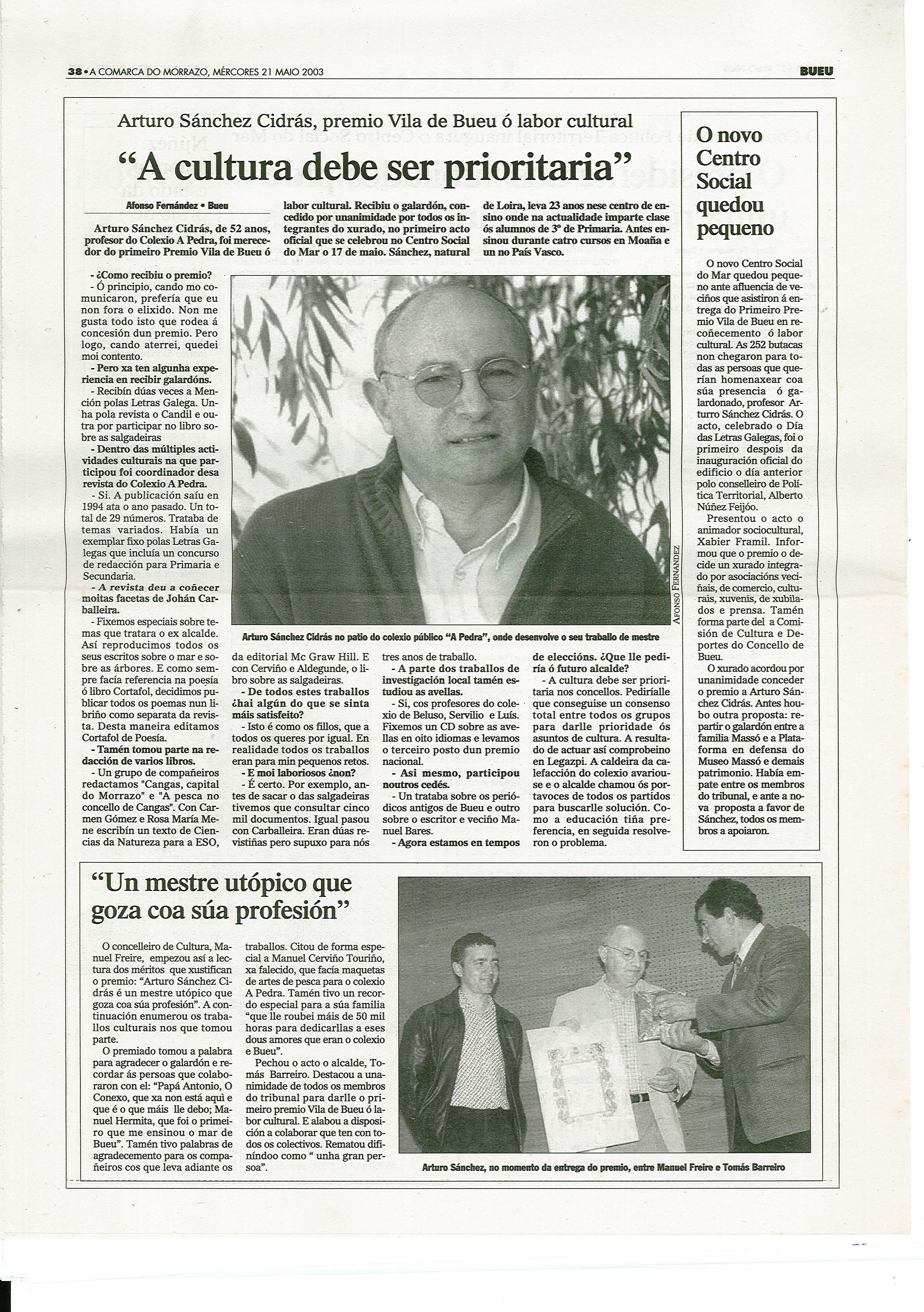 -I Premio Vila de Bueu en Recoñecemento ó Labor Cultural "polo seu compromiso, dende hai décadas, pola defensa e a promoción do patrimonio histórico e cultural" de Bueu. O xurado estivo composto por representantes da corporación, das asociacións veciñais, do comercio e da prensa.